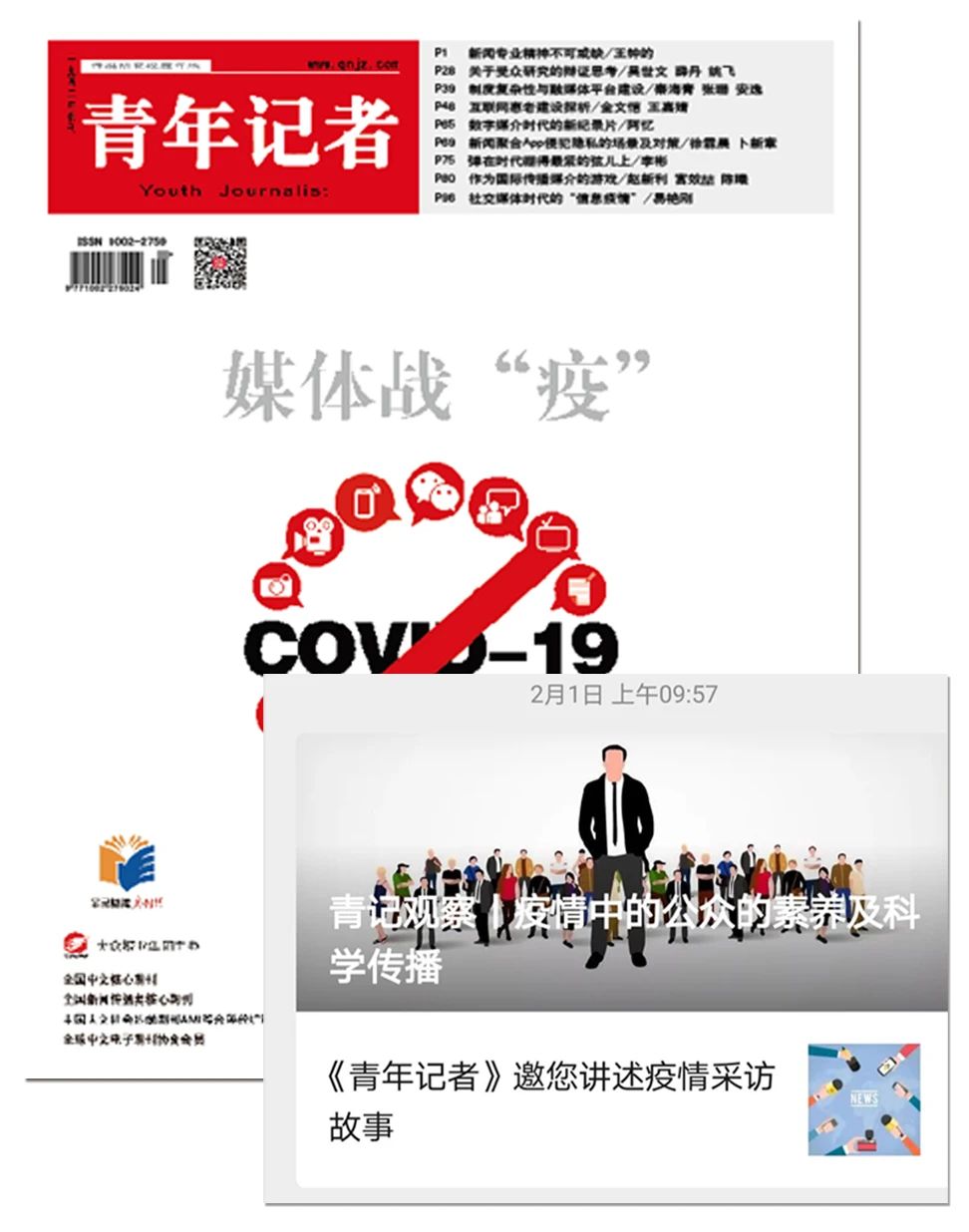 新冠肺炎疫情暴发后,新闻人与医护人员一样,奔向战“疫”前线。作为“逆行者”,记者把镜头对准了疫情严重地区的民众;作为新闻专业期刊,也应做他们的关注者和支持者,与他们一起加入战“疫”报道的行列。《青年记者》一直以“先进传媒文化的倡导者”为己任,迅速做出决定:在微信公众号“青年记者”上开设“青记观察”作为战“疫”传播研究专栏,密切关注疫情发展中一线记者及各类媒体的传播动态。“青记观察”主要从三方面推出疫情报道系列观察性文章:一是一线战“疫”记者的采访体会和优秀报道分析,为他们鼓与呼;二是及时总结各类媒体在疫情传播中的成功经验,反思其中出现的问题,为下一步的疫情报道提供参考;三是沟通学界的深入观察和研究,为疫情结束后对整个疫情信息传播进行全面的分析研究做好准备。