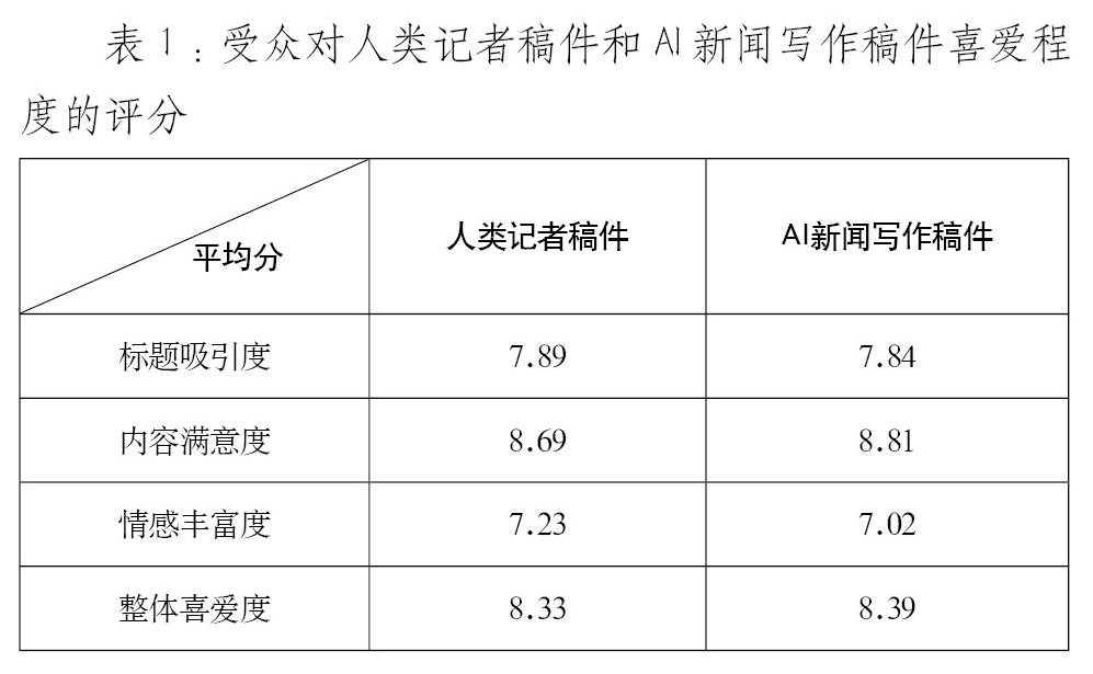 研究通过向受众展示主题相近的人工撰写和AI写作的新闻消息,让受众主观地从标题吸引度、内容满意度和情感丰富度三个方面进行评分,并据此计算出整体喜爱度的分数,研究结果如表1所示: