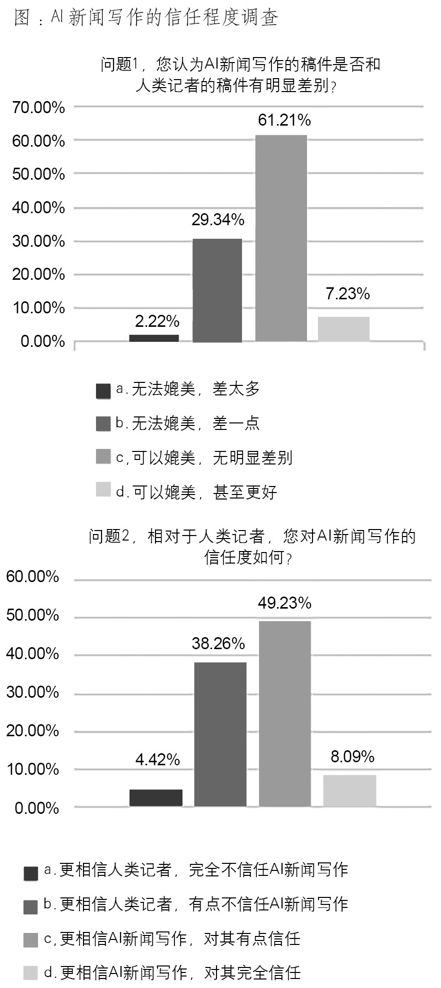 调查结果表明(见下图),超过6成的被调查者主观上认为AI写作的稿件可以媲美人工写作,而使用四级量表测试关于AI写作的调查证明,在面对数据较多的财经和体育新闻时,完全不信任AI新闻的占比不足5%,而选择更相信AI的比例超过了一半,这说明受众对AI新闻的信任程度已经高过了人工采写的署名新闻。